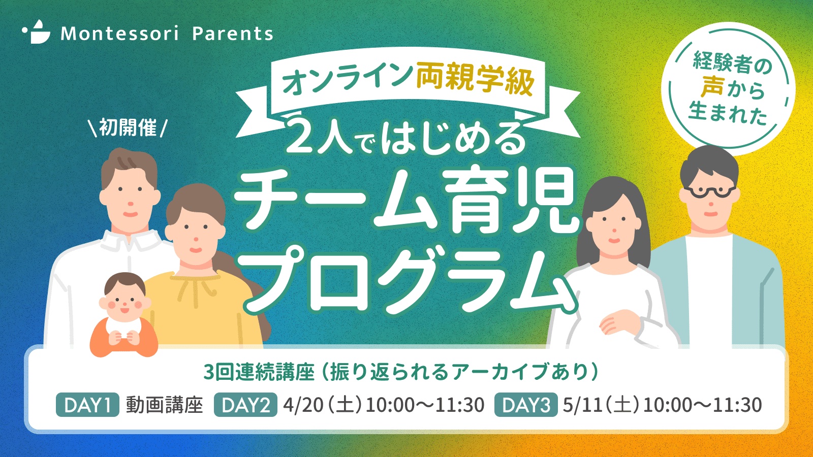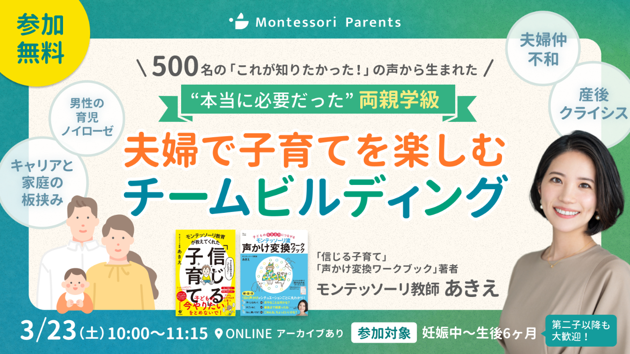 本イベントは、夫婦のチーム育児力を高める3ヶ月間の完結プログラム「チーム育児プログラム」への入門イベントとなります。プログラムのご興味のある方はこちらをご覧ください